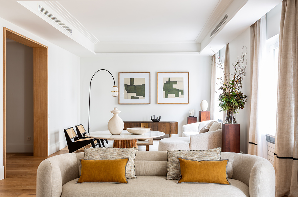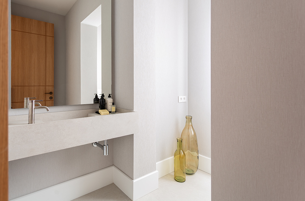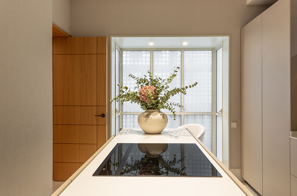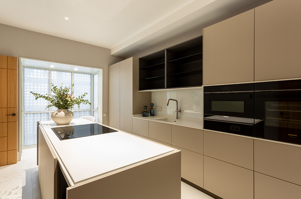 - Kitchen with island: Dekton Uyuni countertop, high-end Zampieri cabinetry, Siemens appliances, integrated porcelain sink Taj Mahal Sapienstone, Gessi tapware, walls finished in Lucca model (color 105 off-white), and Floss Bone flooring.