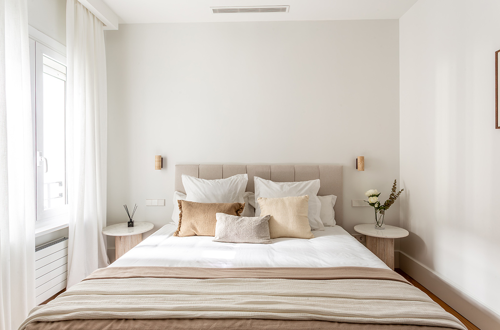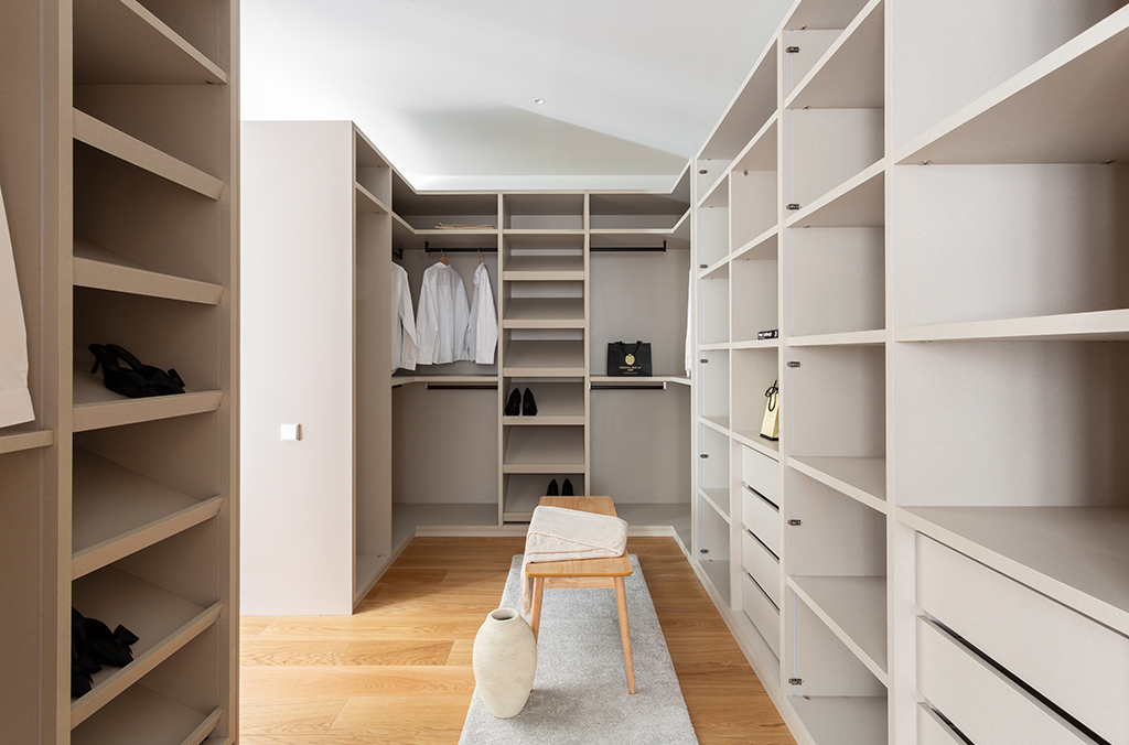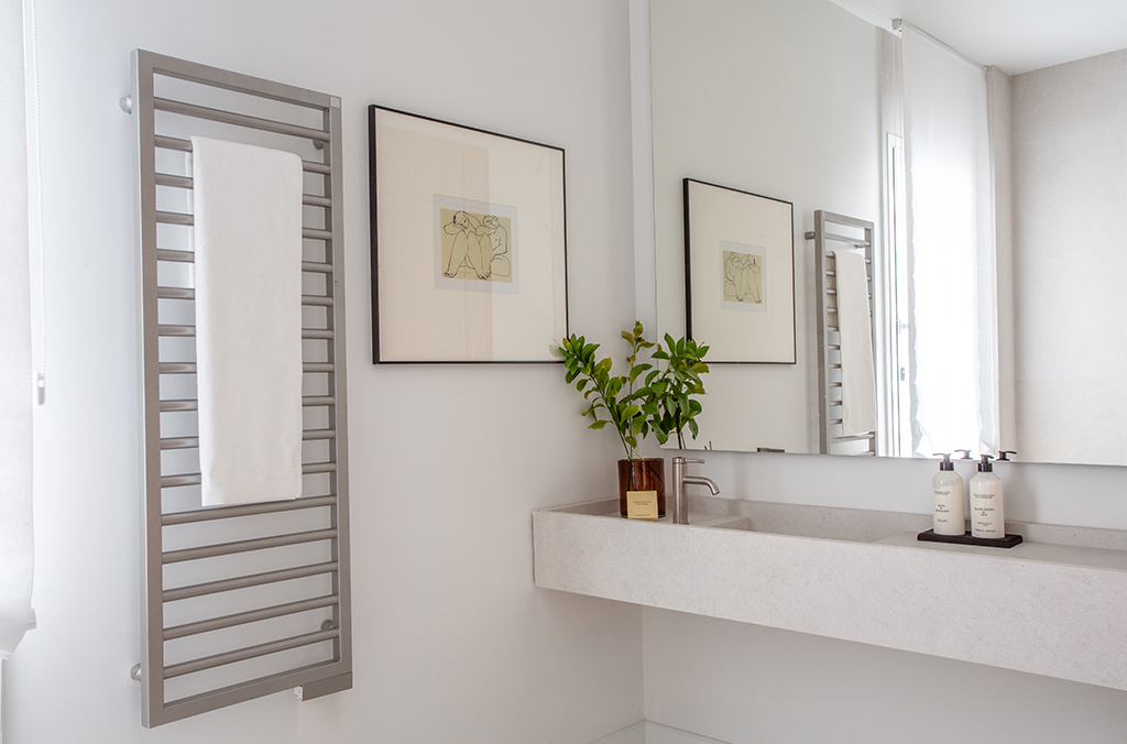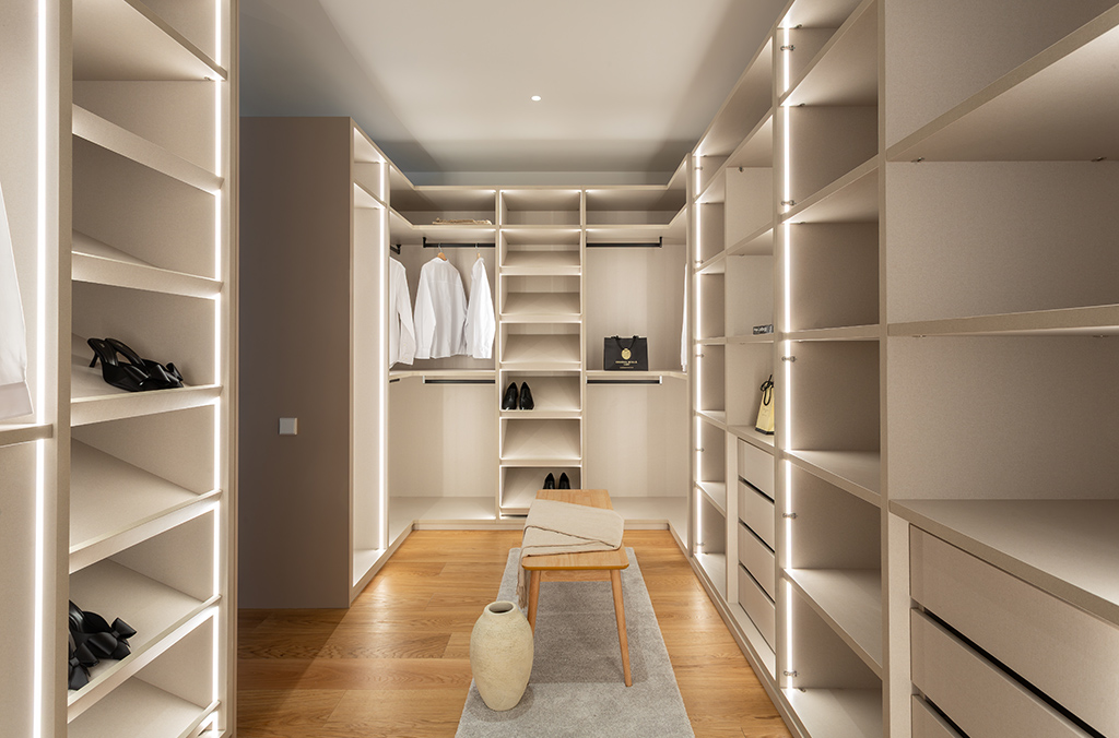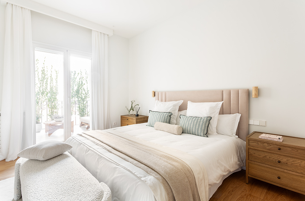 - Kitchen with island: Dekton Uyuni countertop, high-end Zampieri cabinetry, Siemens appliances, integrated porcelain sink Taj Mahal Sapienstone, Gessi tapware, walls finished in Lucca model (color 105 off-white), and Floss Bone flooring.