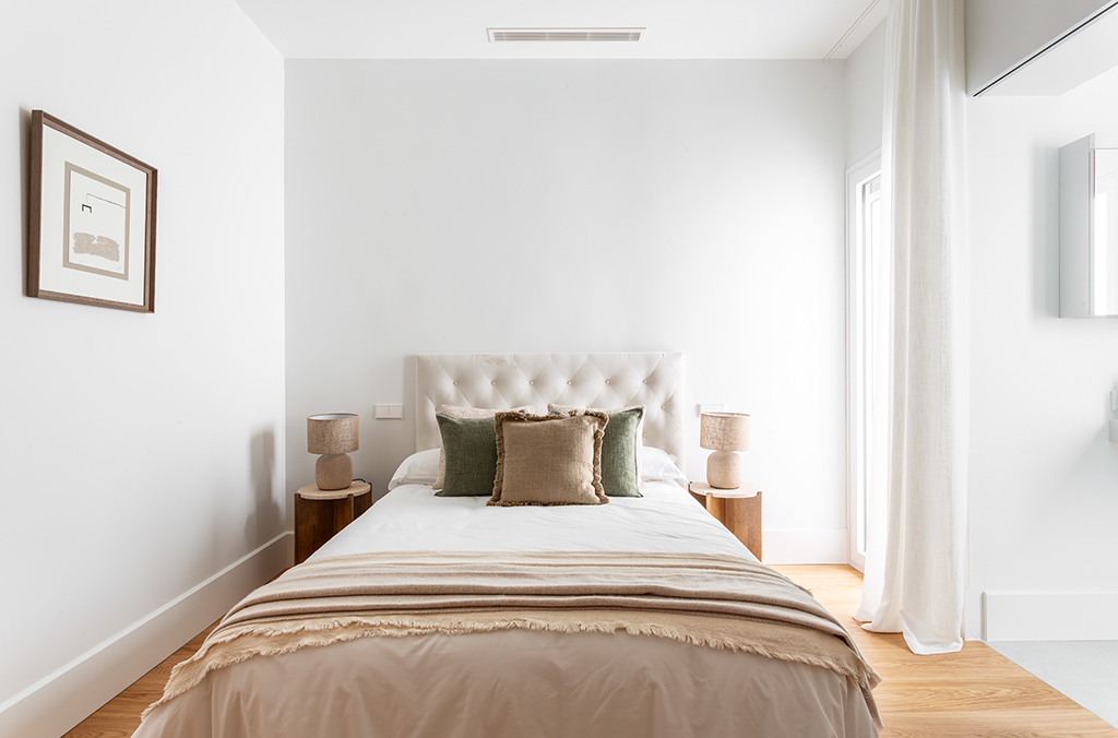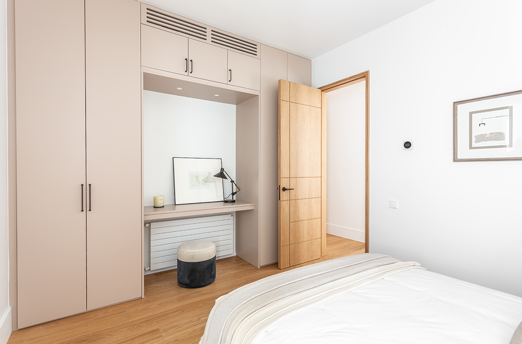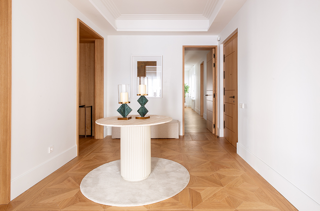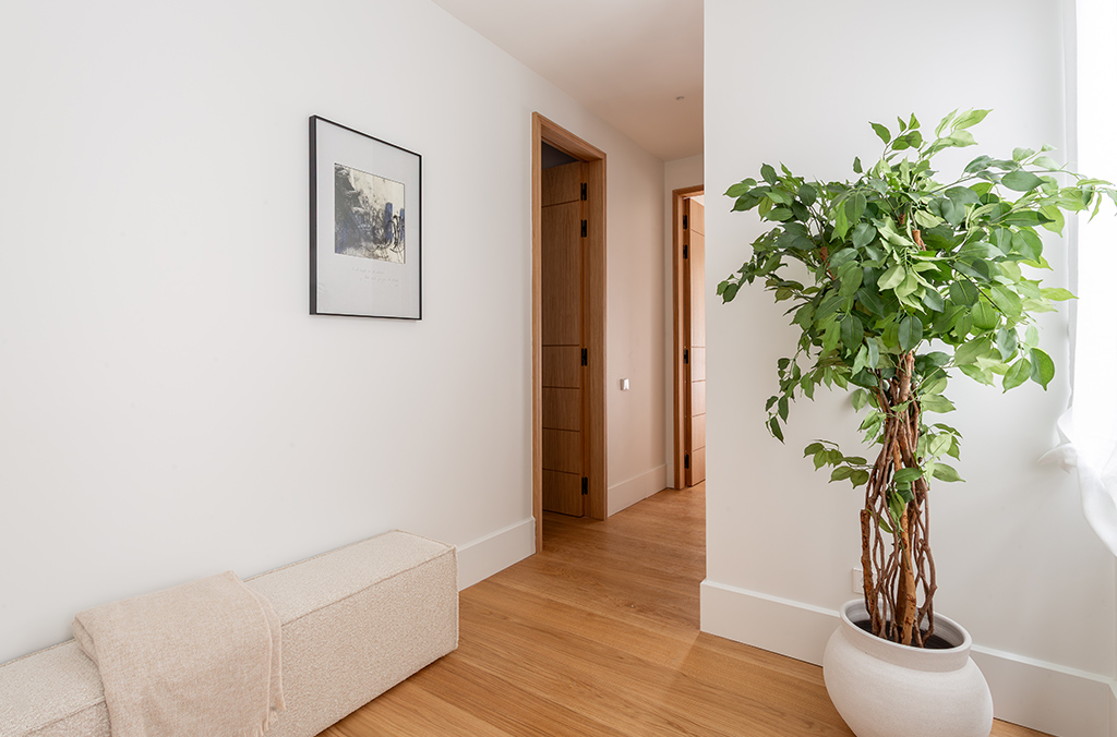 - Hallways and bedrooms: multilayer oak wood flooring with transparent varnish.