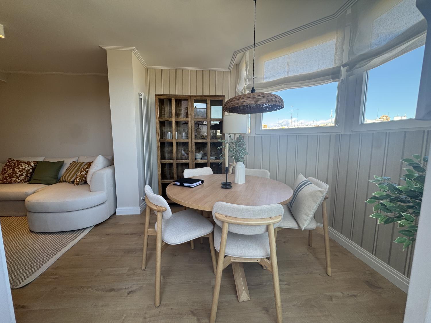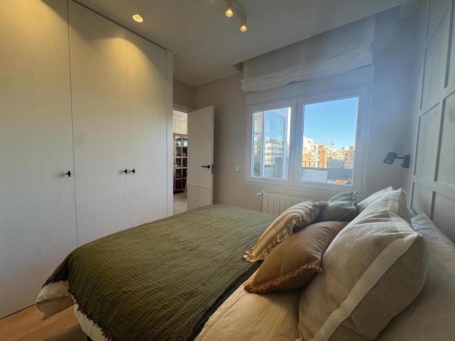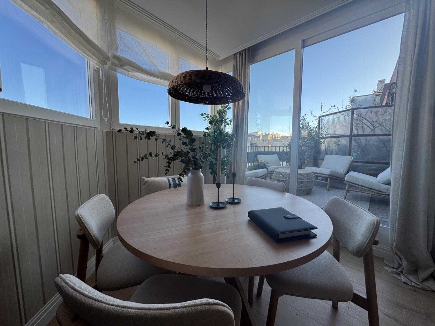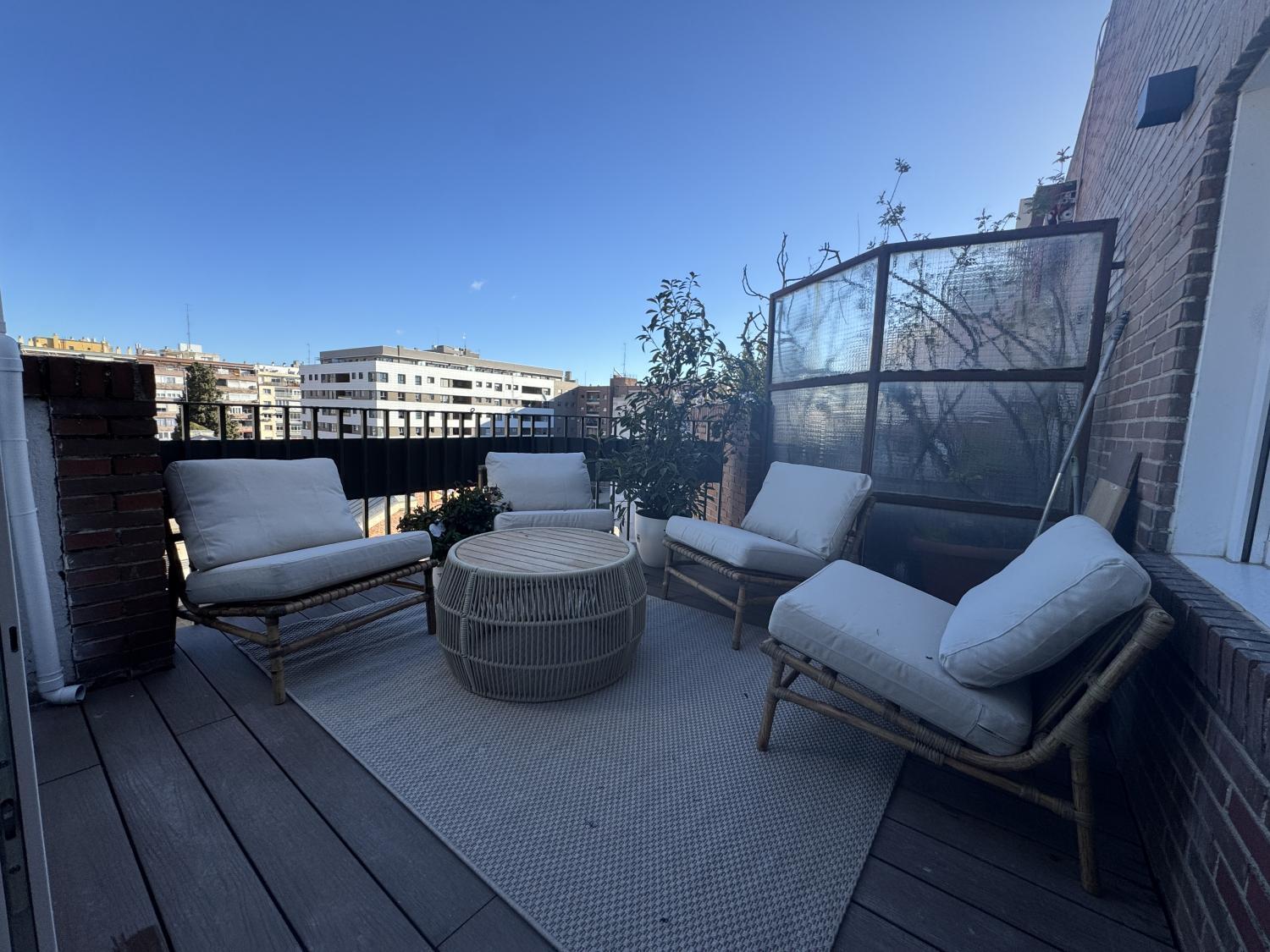 Precioso ático con maravillosa reforma de diseño a estrenar, súper luminoso, tranquilo y muy acogedor. La reforma se ha realizado aprovechando al máximo los espacios, consiguiendo una perfecta distribución. Se entrega completamente amueblada y equipada, con mobiliario, electrodomésticos y materiales de primera calidad, muy bien equipada de armarios. Se distribuye en: amplio salón comedor con cocina abierta y salida a una fantástica y espaciosa terraza de 8 m2 con fantásticas vistas, habitación principal con baño en suite y segunda habitación también de buen tamaño, con baño en pasillo, que también puede utilizarse para invitados. Calefacción y agua caliente individuales. Aire acondicionado por conductos en toda la casa. Alarma instalada Ventanas motorizadas con vidrios dobles de gran anchura y máxima calidad, totalmente aislantes del ruido y temperatura. Suelos de madera natural de roble en toda la casa, excepto cerámicos en los baños. Muy bien situada en zona con los mejores servicios, colegios, hospitales, y perfectamente comunicada, tanto mediante transporte público como privado y con rápido acceso a la M30. La finca cuenta con portero físico Comunidad: 80 € IBI: 280 €