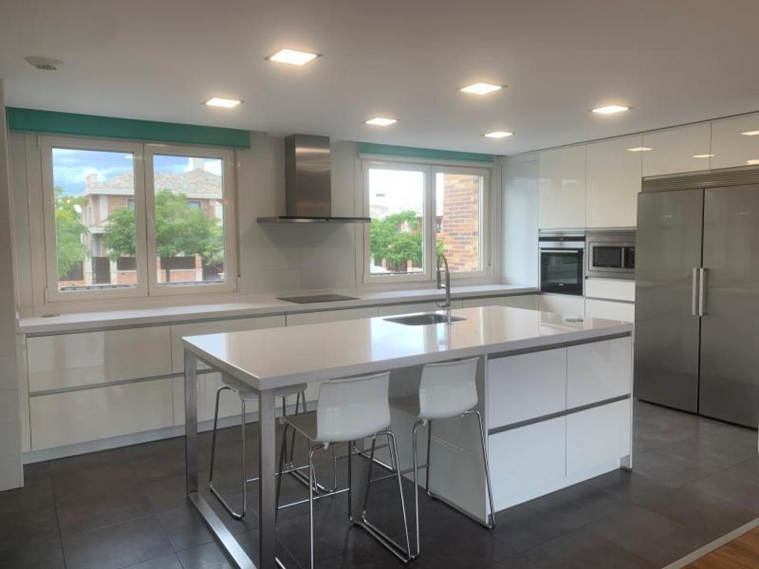 Bonito chalet adosado en la urbanización Roza Martín de Majadahonda. Estupendas zonas comunes con piscina y pista de pádel. Planta principal con salón/comedor y cocina integrada totalmente equipada y con salida directa a bonita terraza y jardín con frutales. Aseo de cortesía. Planta primera con dormitorio principal en suite, y otros dos buenos dormitorios (uno de ellos con terraza) que comparten cuarto de baño fuera. Buhardilla con salón diáfano y cuarto de baño. Planta sótano con zona de lavandería, despensa, cuarto de baño y una sala multifunción con gimnasio y billar. Garaje para 3 coches y buenos armarios para almacenamiento. Persianas eléctricas y mosquiteras. Aire acondicionado y calefacción por gas natural. Alarma y seguridad 24h.