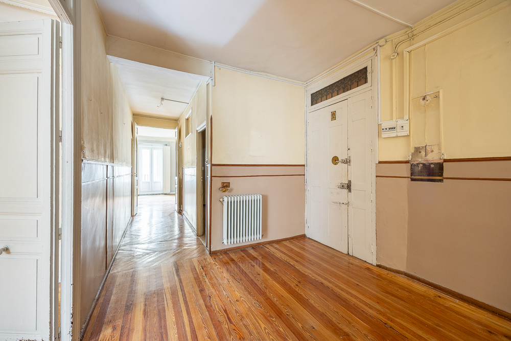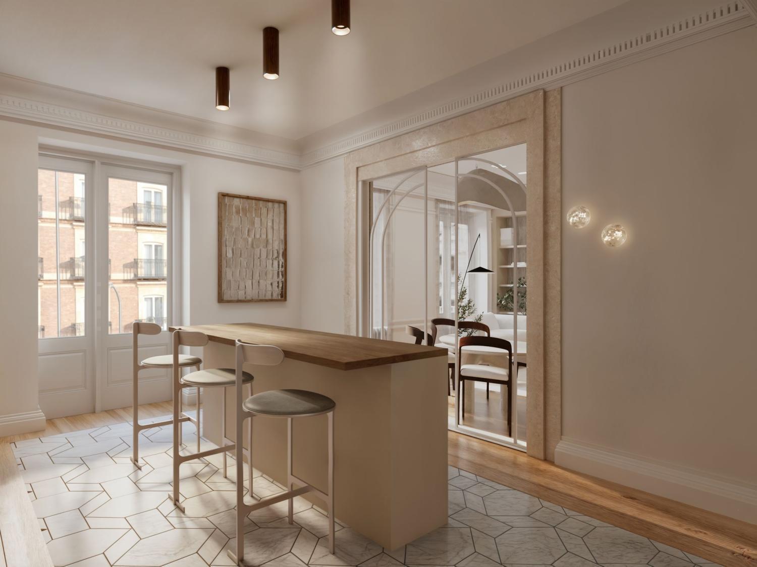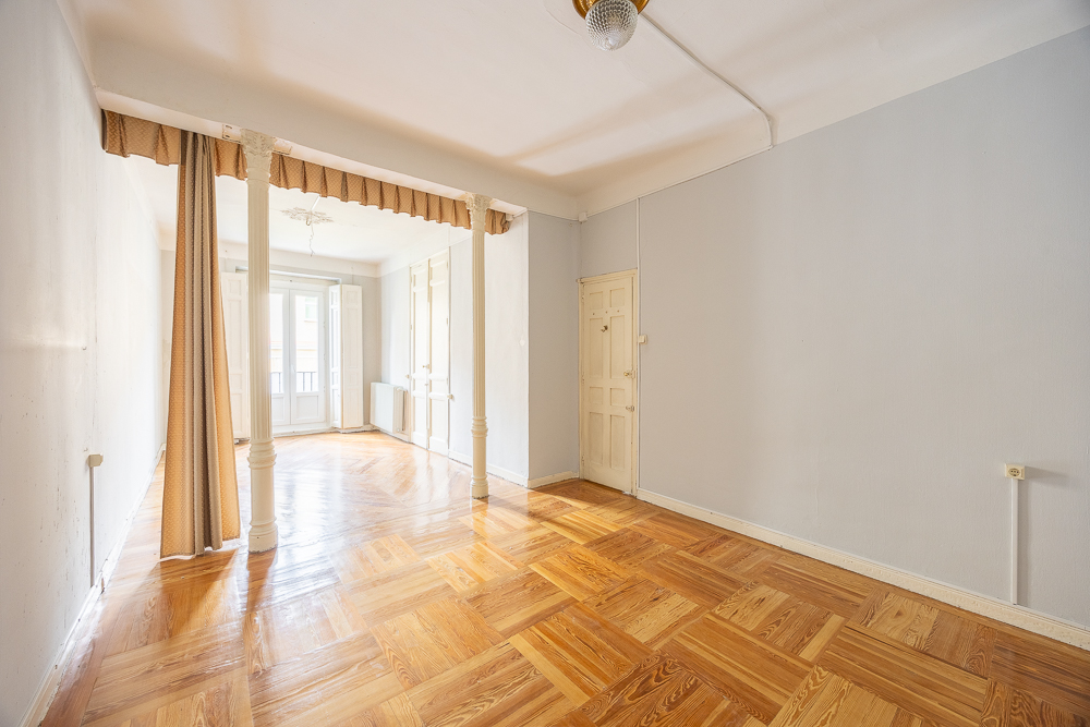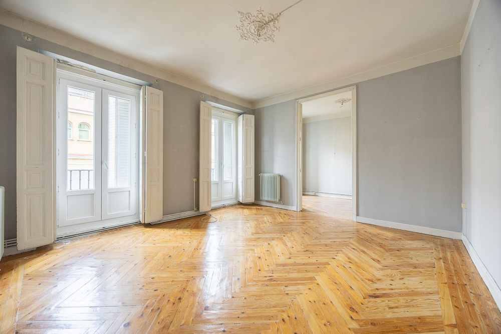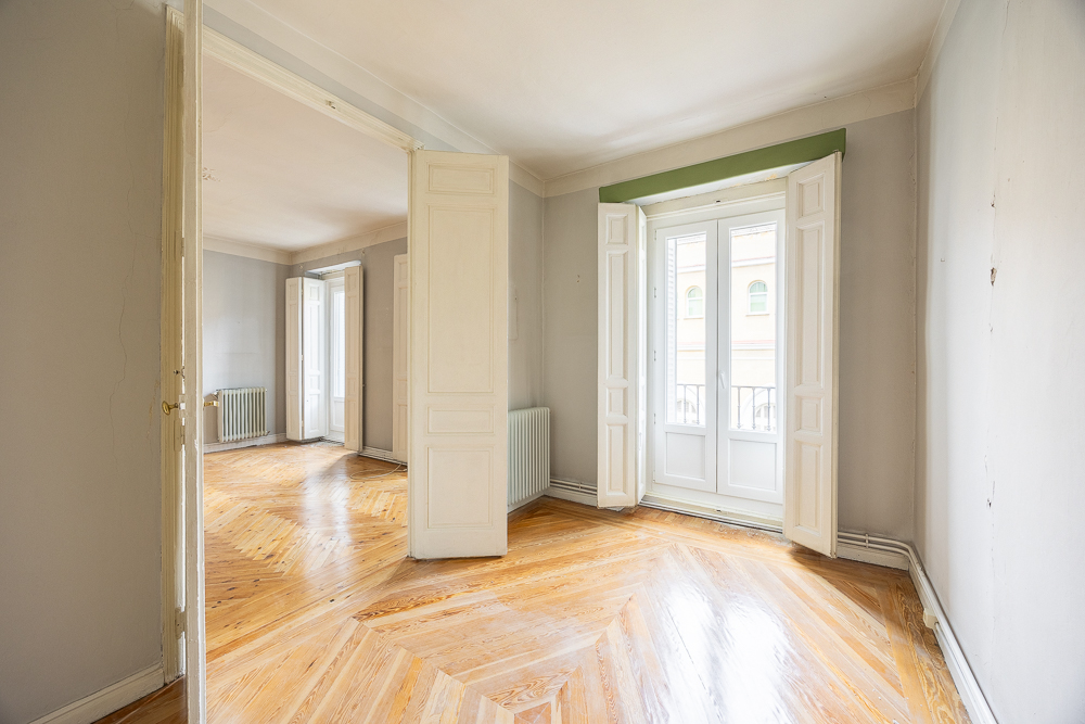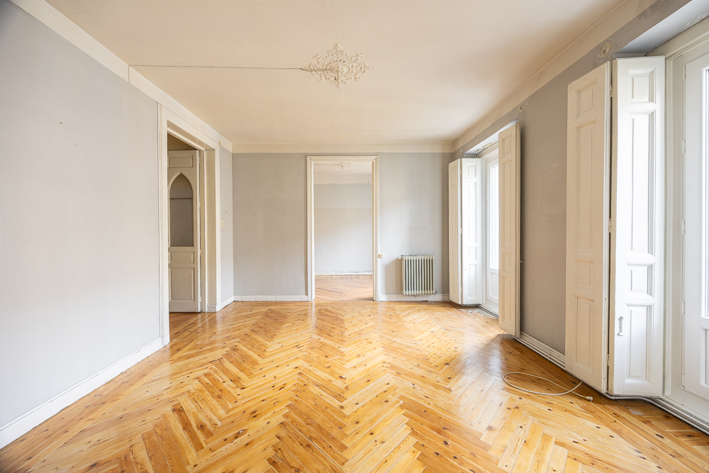 Spectacular home in a classic building with four balconies overlooking the street, located in the sought-after Justicia neighbourhood. Completely renovated to a high standard. Situated in one of Madrid’s most iconic and vibrant districts. The property features an elegant entrance hall with guest cloakroom and built-in wardrobes, leading into a spacious living-dining area with three balconies facing the street. Adjacent to the living room, a stylish exterior-facing kitchen is enclosed by a glass-panelled partition. Separate laundry area and staff quarters with bedroom and bathroom. The impressive principal suite includes a large walk-in wardrobe and en-suite bathroom. Two further double bedrooms, each with en-suite bathrooms. Original herringbone wood flooring, high ceilings, and abundant natural light throughout. Individual heating and air conditioning. Classic period building with concierge service. IBI (annual property tax): €1,651 Community fees: €267/month