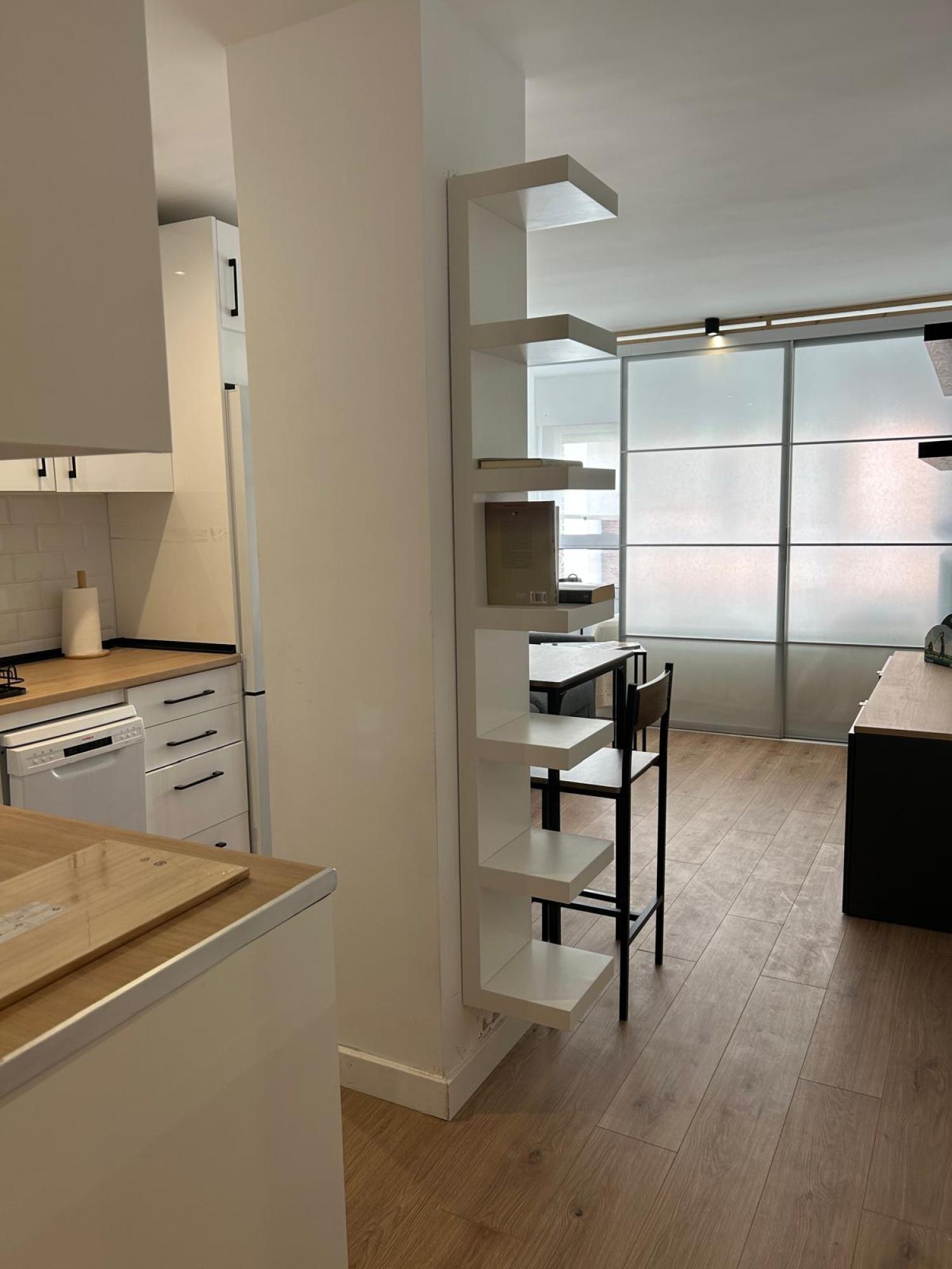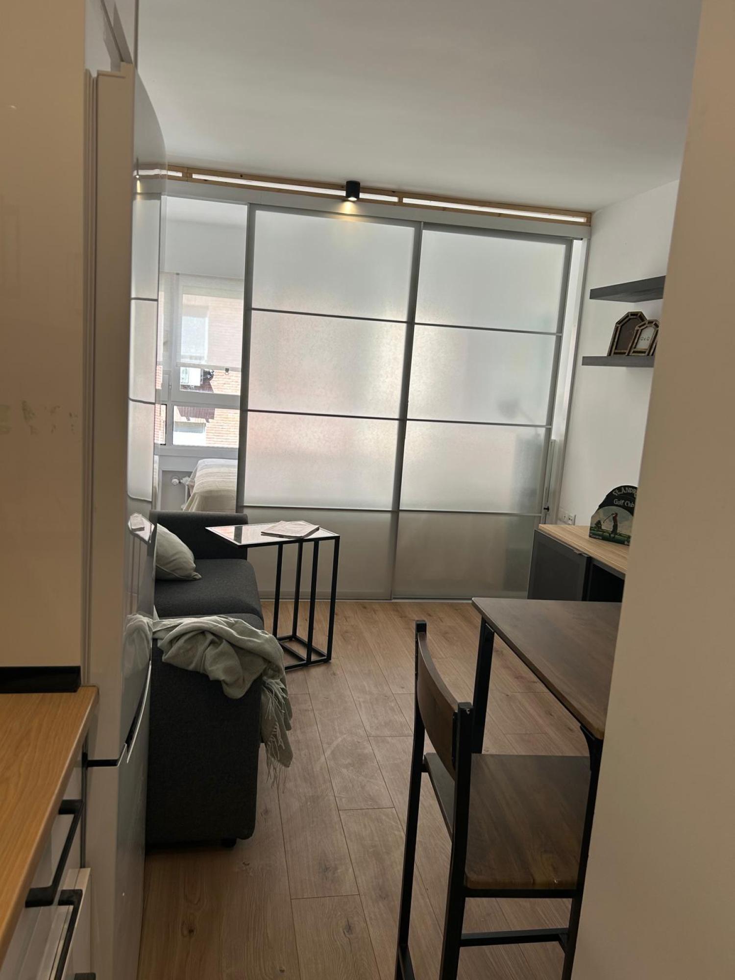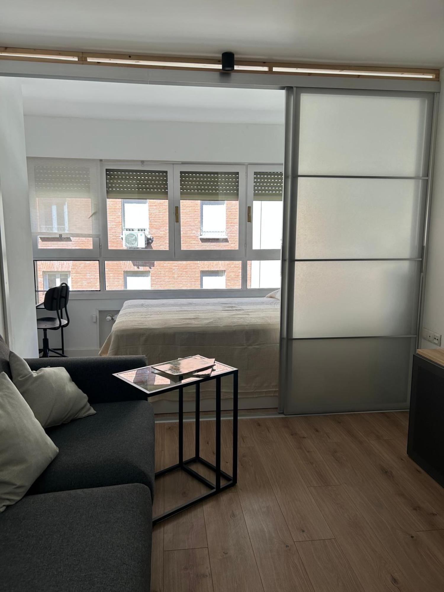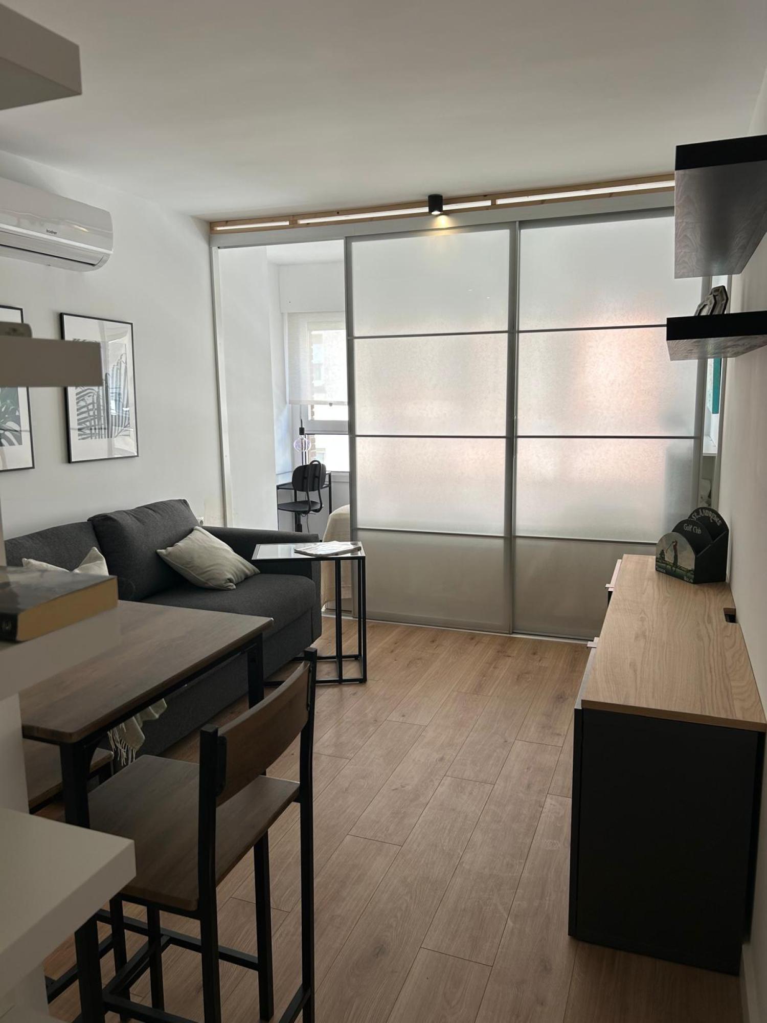Estudio ideal, exterior, muy luminoso y soleado. Amueblado. Cocina equipada con todos los electrodomésticos, la cama de 1,35 se encuentra separada del salón por unas puertas correderas y el cuarto de baño es independiente. Muy buen edificio con portero. Aire acondicionado y calefacción individual por gas natural.