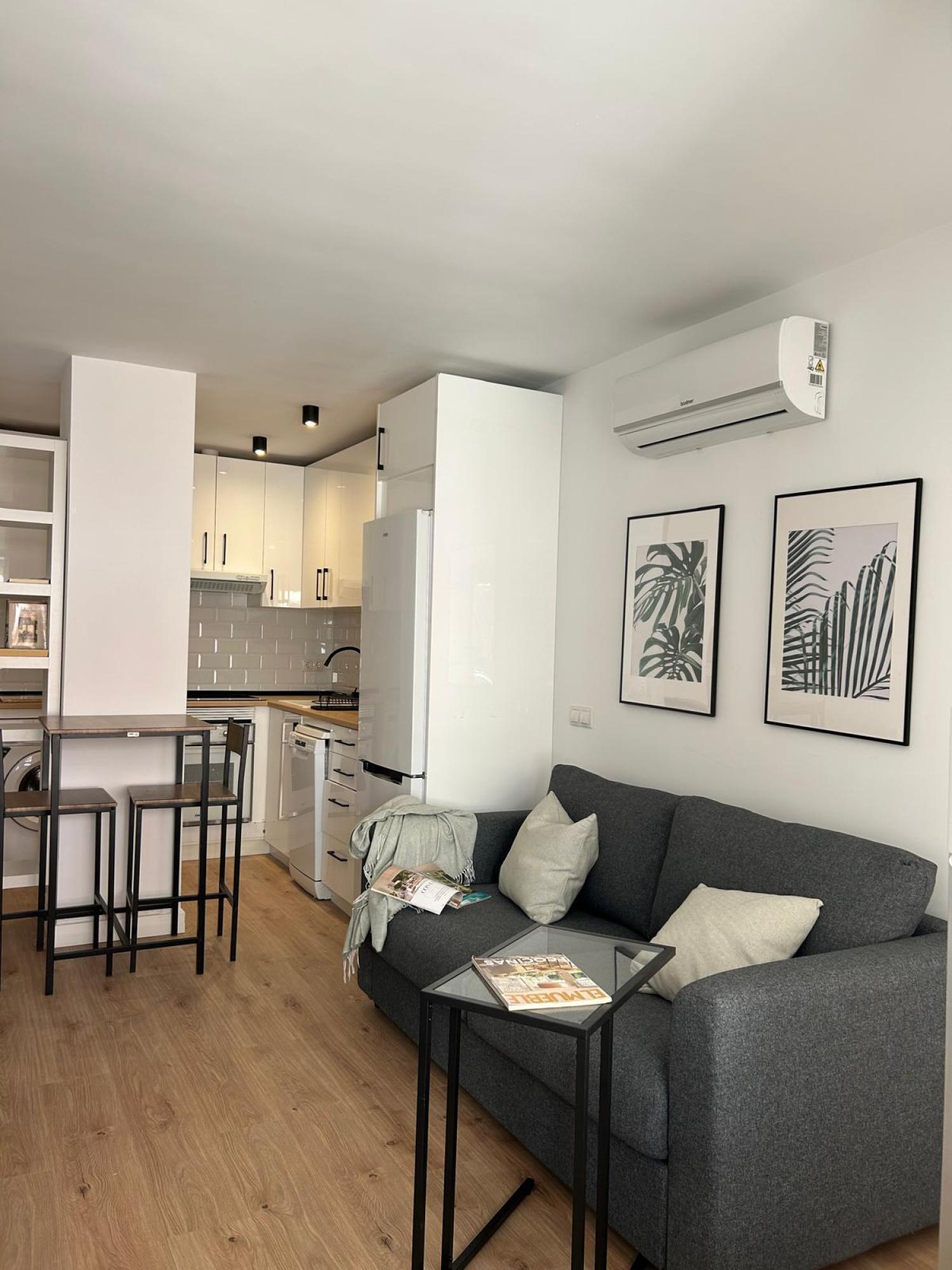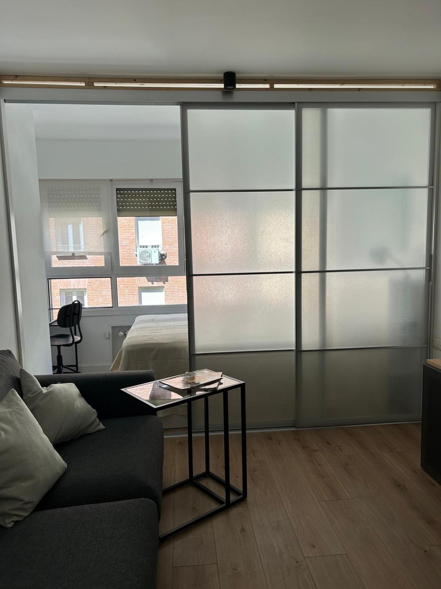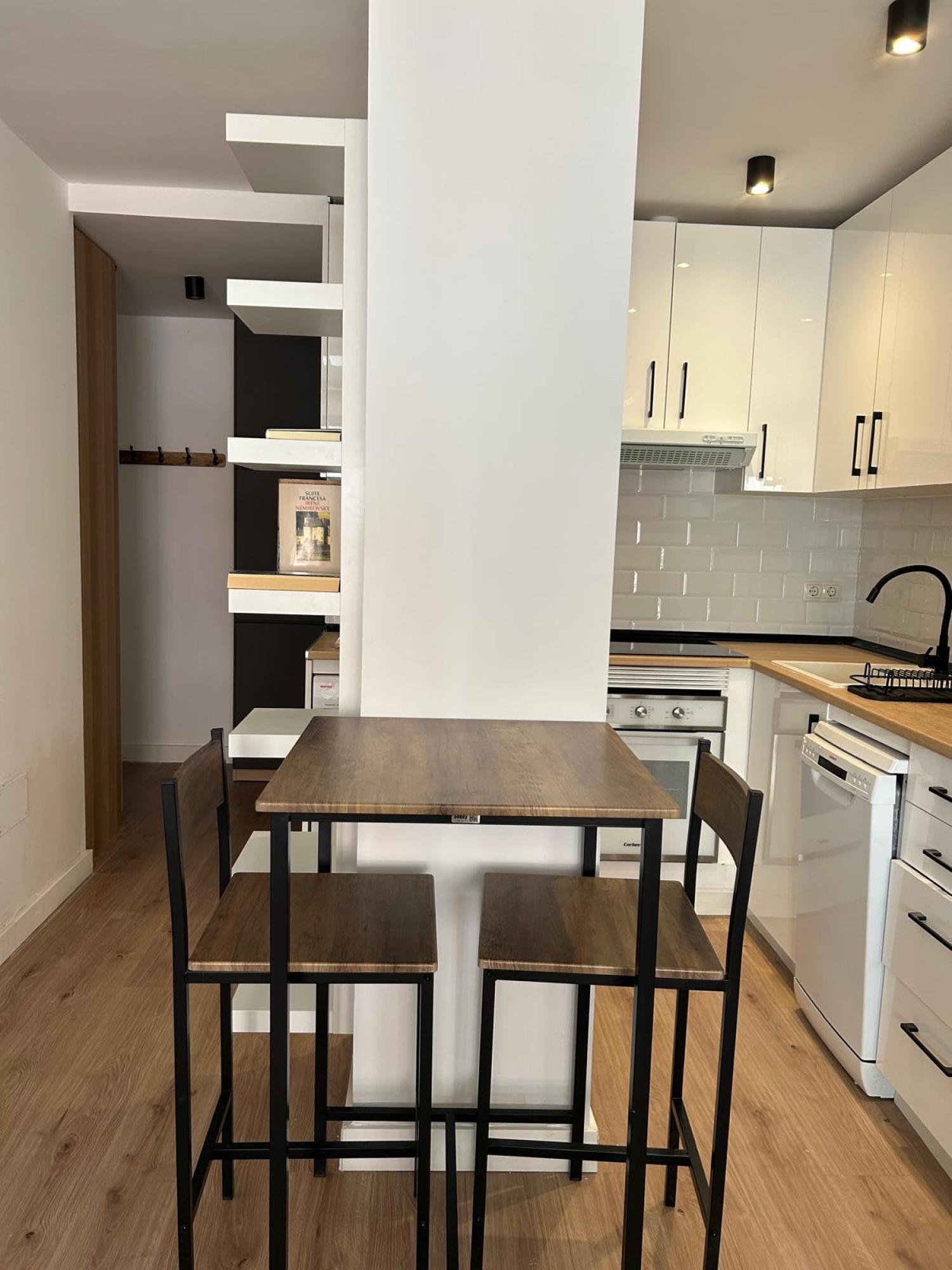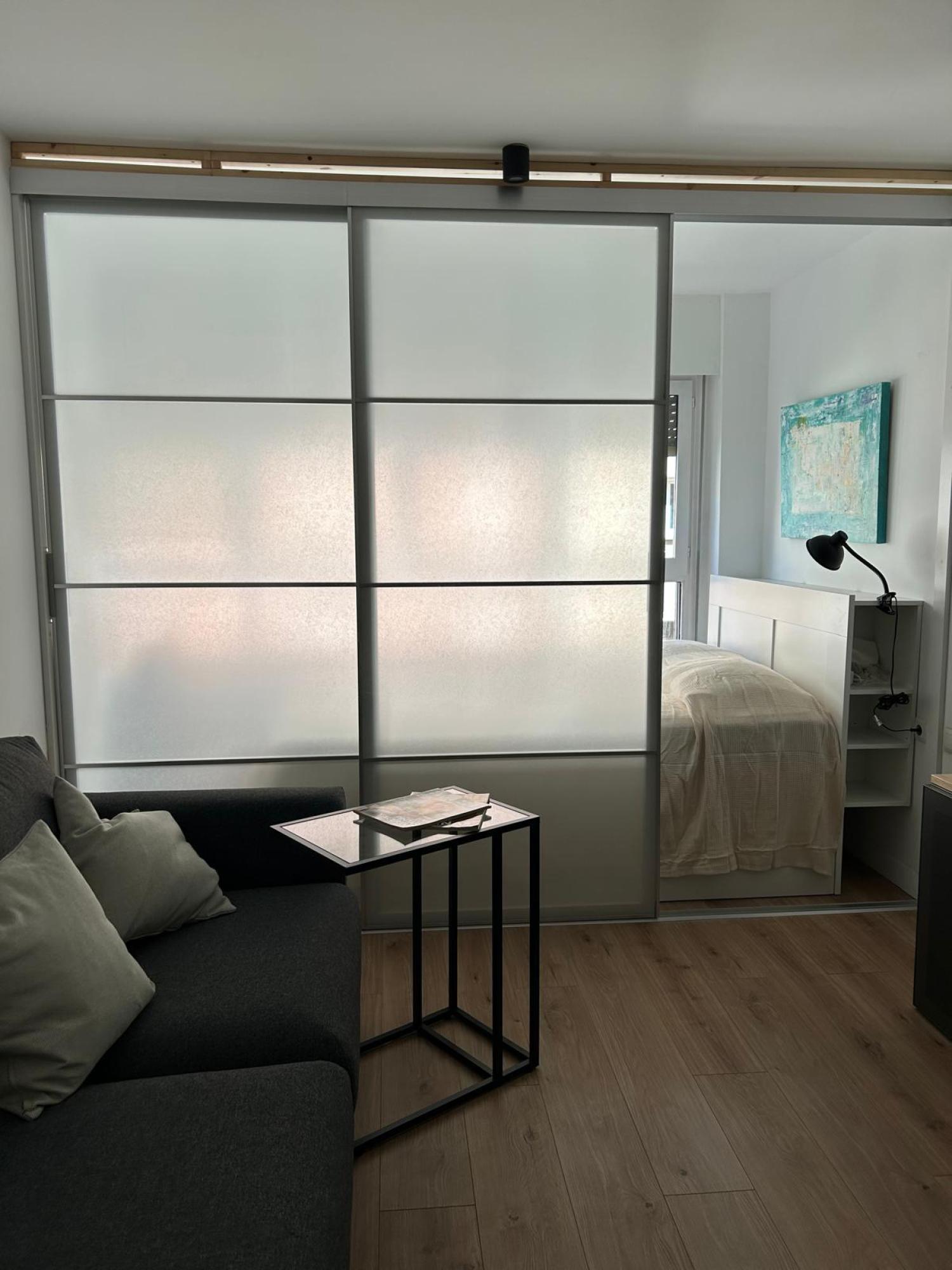 Estudio ideal, exterior, muy luminoso y soleado. Amueblado. Cocina equipada con todos los electrodomésticos, la cama de 1,35 se encuentra separada del salón por unas puertas correderas y el cuarto de baño es independiente. Muy buen edificio con portero. Aire acondicionado y calefacción individual por gas natural.