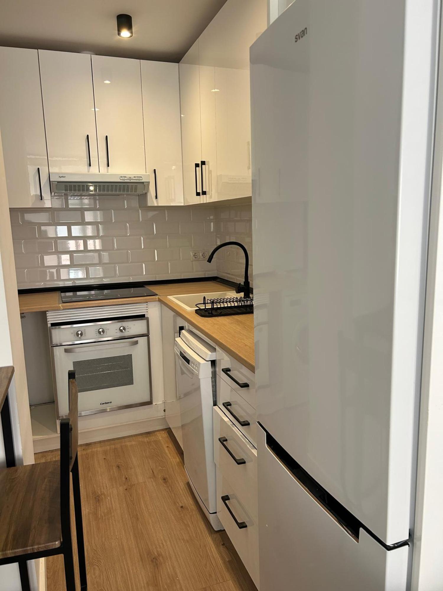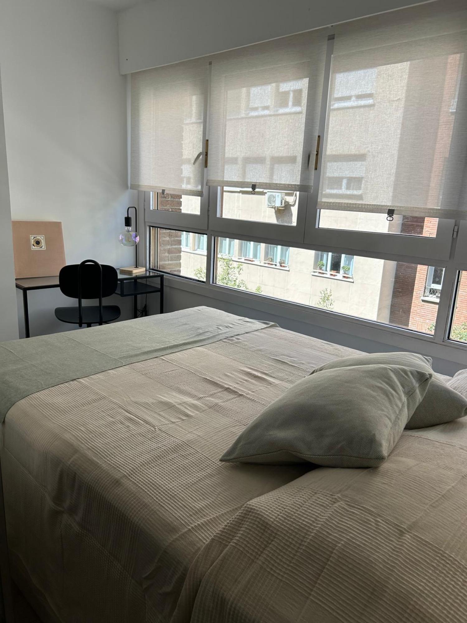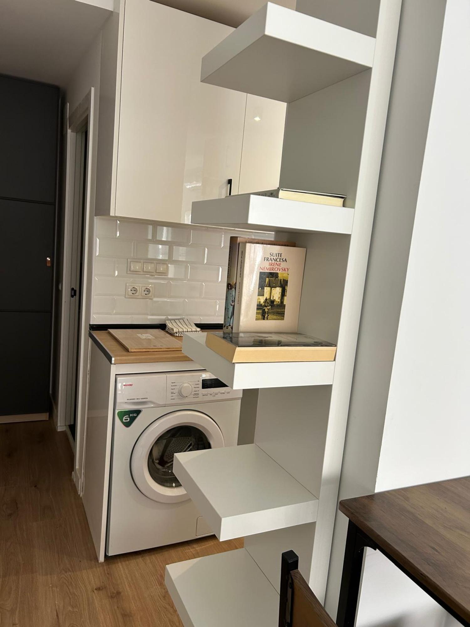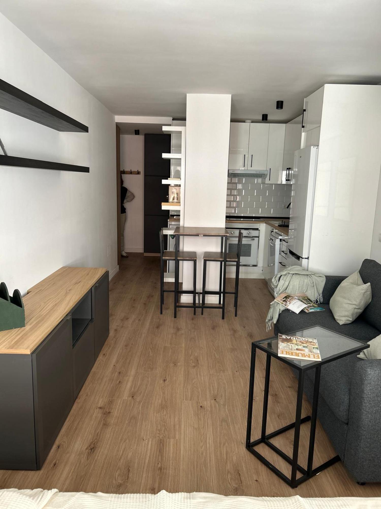 Estudio ideal, exterior, muy luminoso y soleado. Amueblado. Cocina equipada con todos los electrodomésticos, la cama de 1,35 se encuentra separada del salón por unas puertas correderas y el cuarto de baño es independiente. Muy buen edificio con portero. Aire acondicionado y calefacción individual por gas natural.
