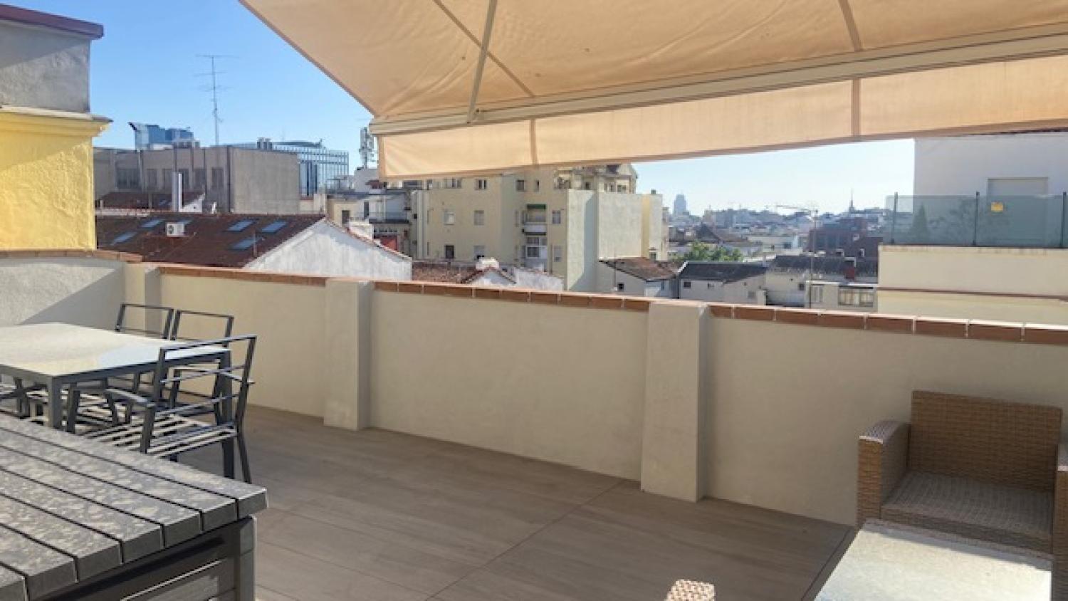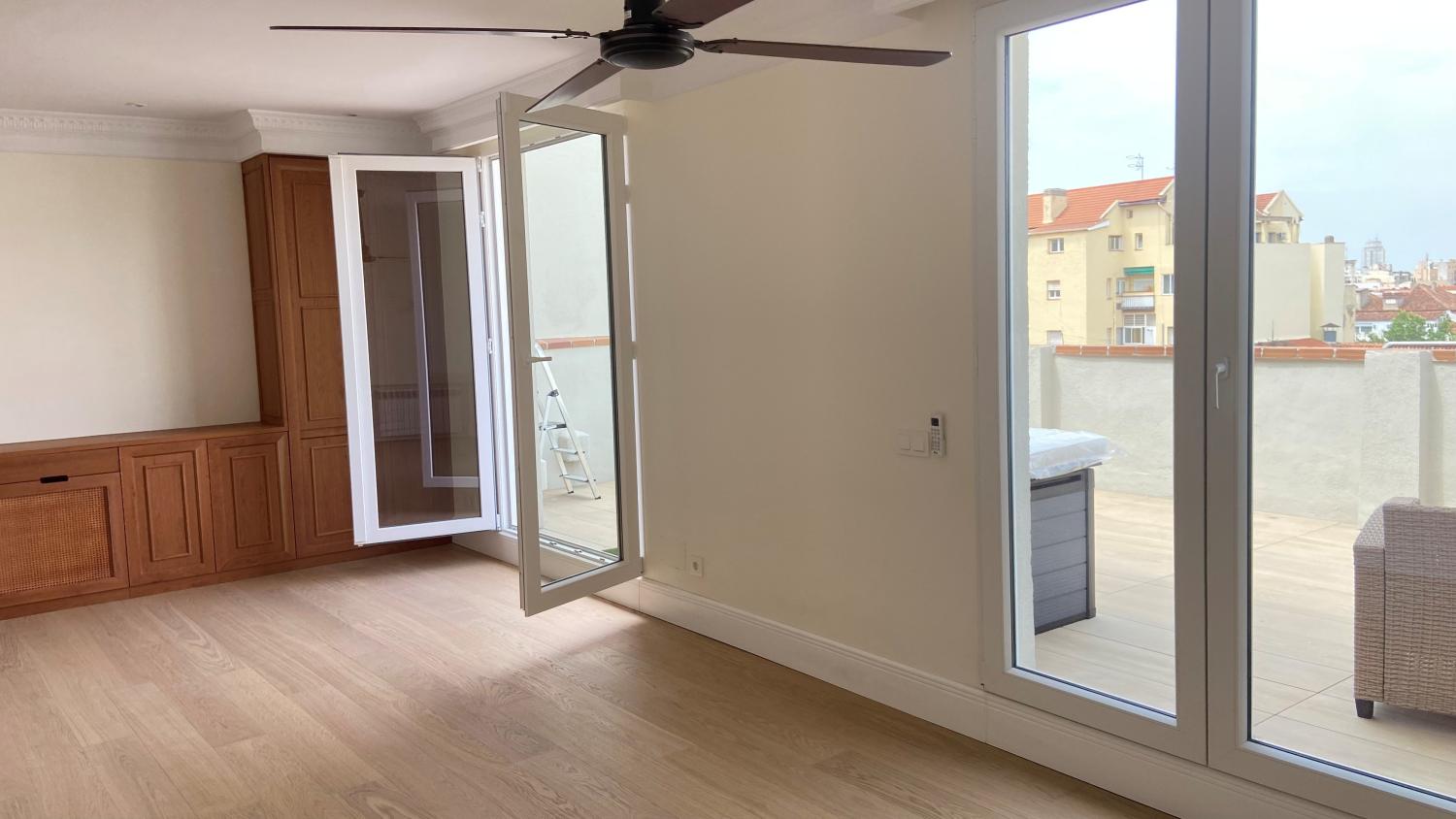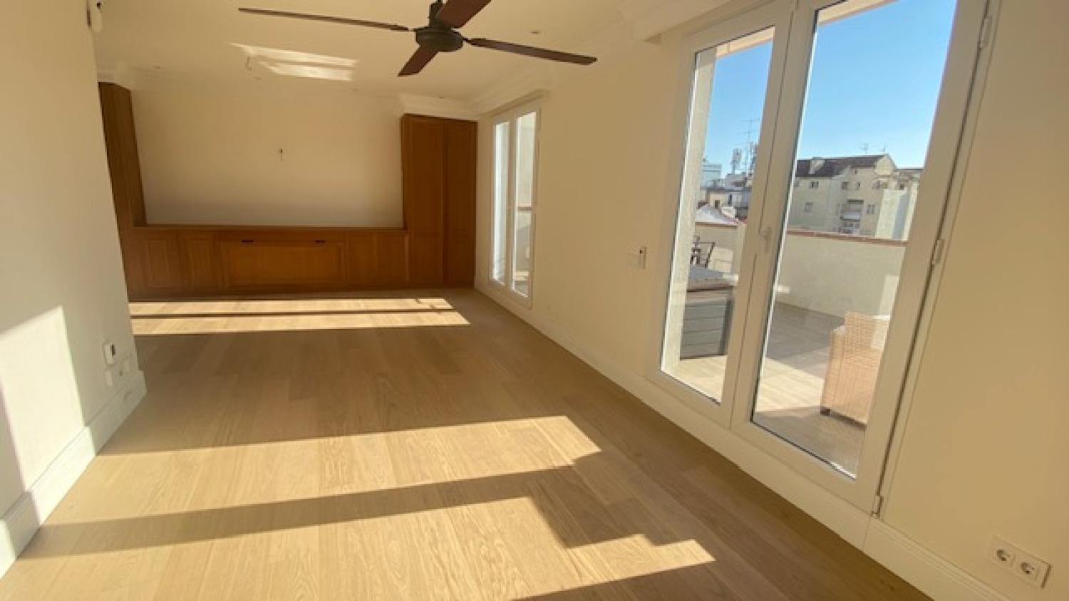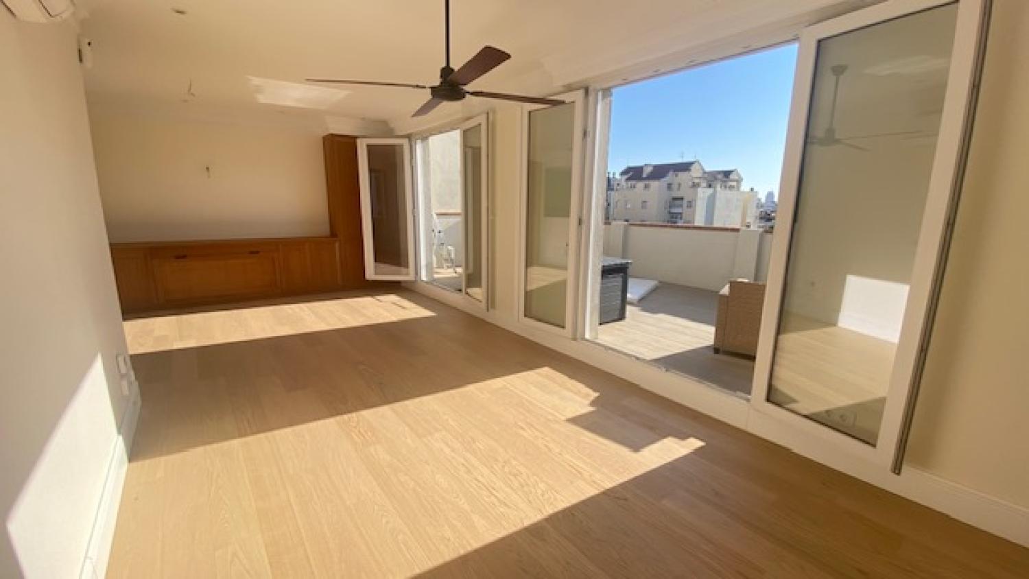 Ático exterior e impecable de 131 m² construidos (123 m² útiles), ubicado en edificio representativo de 1935. Dispone de dos habitaciones, dos baños completos y una amplia terraza. Cocina equipada con zona de lavandería separada. Aire acondicionado y ventiladores en todas las estancias. Conserjería en el edificio. Vivienda sin amueblar, salvo mobiliario en terraza. Plaza de garaje opcional por 300 €/mes.