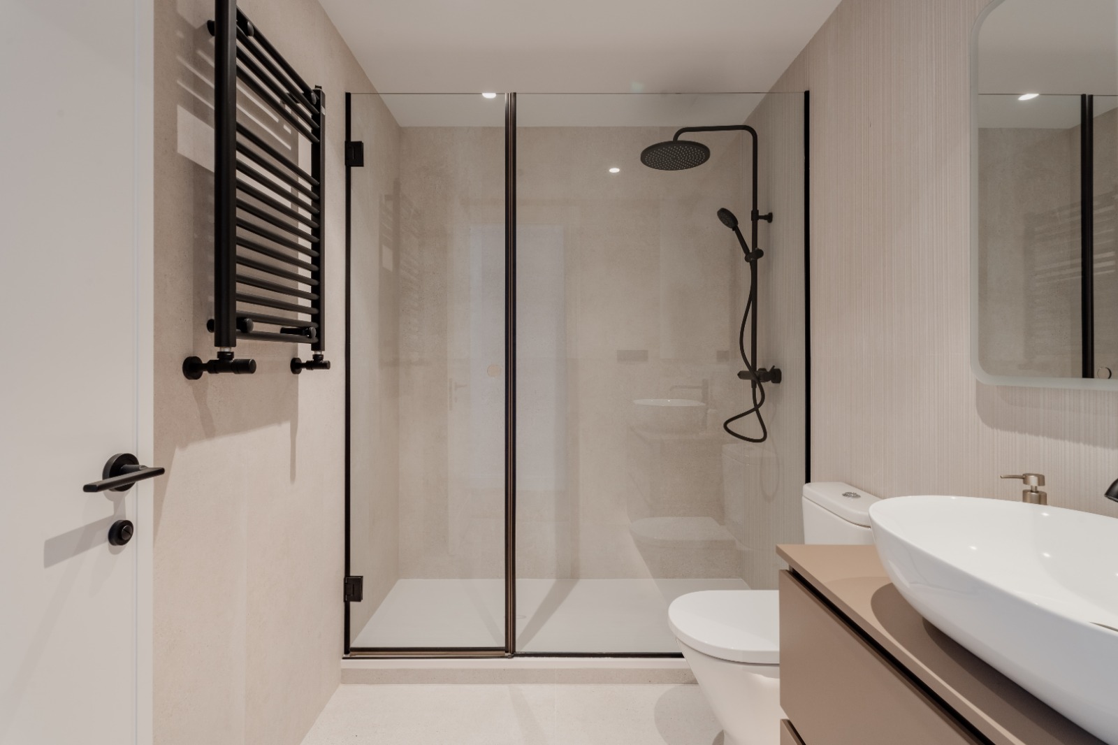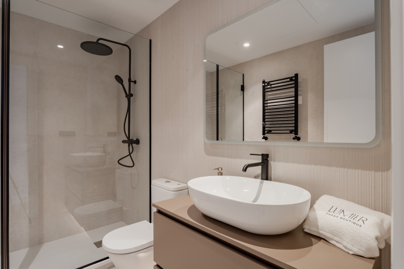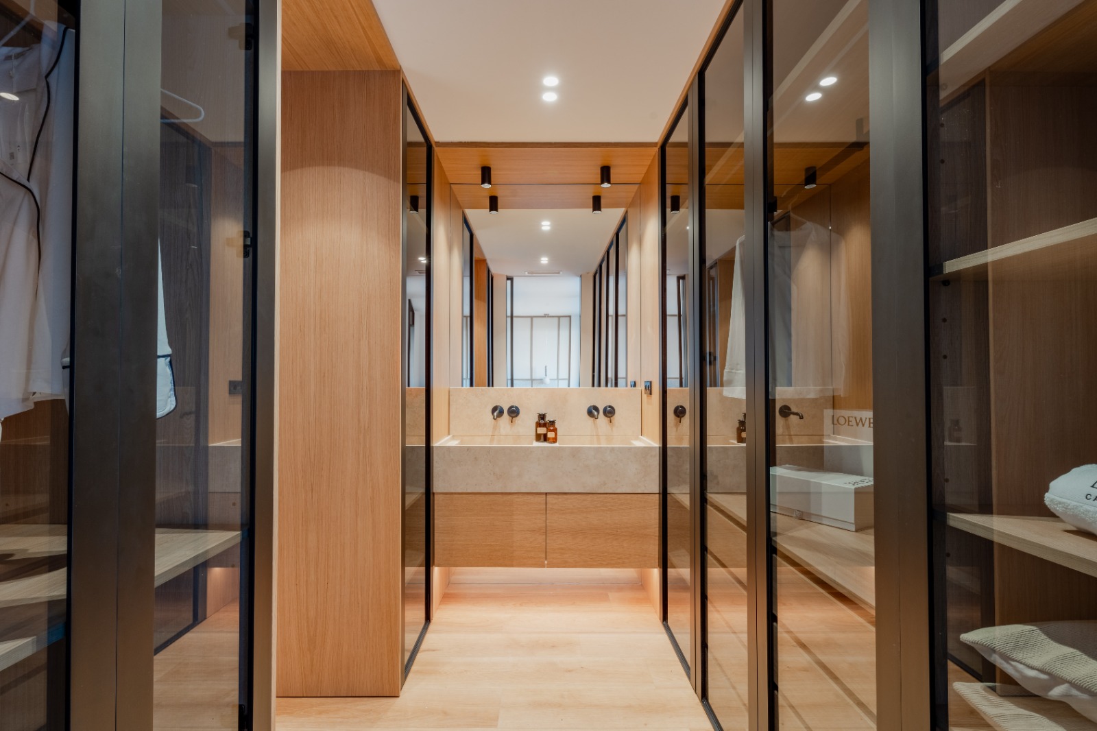 The private quarters include three en-suite bedrooms, each thoughtfully designed for maximum comfort and privacy. The primary suite stands out with direct access to the terrace, an expansive walk-in dressing room, and a beautifully appointed bathroom. A fourth full bathroom serves as a stylish guest cloakroom or additional support facility.