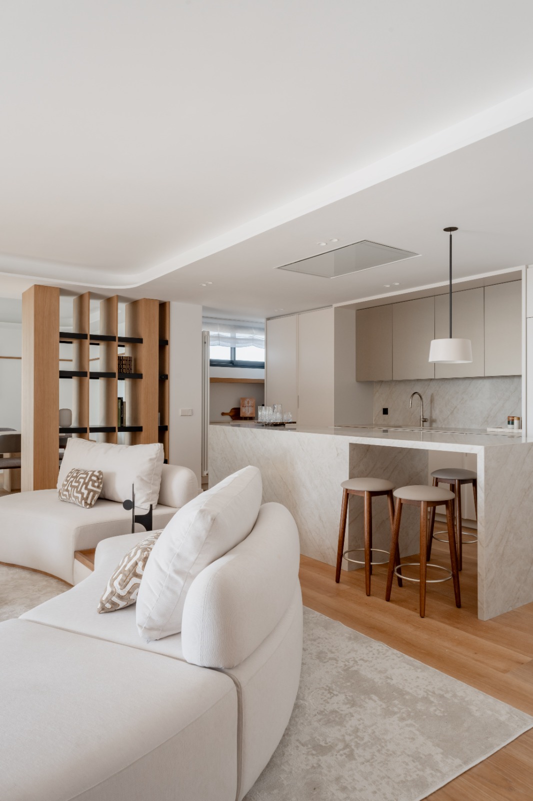 The open-concept living and dining area is bathed in natural light and extends directly onto a generous terrace, designed as a green urban sanctuary with various seating areas — ideal for both entertaining and relaxation. The kitchen, fully integrated into the living space, features a central island and connects to a discreet utility/laundry area for added convenience.