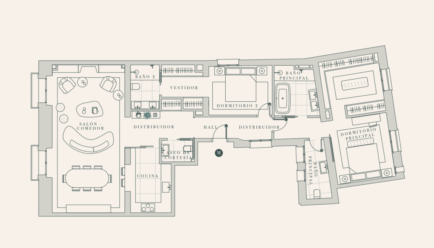 Santa Catalina 5 Promotion Located in a strategic enclave just steps away from the Art Triangle, Santa Catalina 5 is a tribute to the classic architecture of the Barrio de las Letras. This project will become one of the most sophisticated and exciting buildings in the capital, offering an unparalleled living experience. Building Features: Comprehensive Renovation: Original 19th-century building. Exclusive Residences: 9 residences with 2 to 4 bedrooms, with minimum areas of 200 m². Common Areas: Over 200 m² including a wine cellar with a lounge-library, heated indoor pool, sauna, yoga room, and fully equipped gym. Central Courtyard: Filled with vegetation, providing a space of serenity and comfort in the heart of the city. Customization: Darya Custom service to personalize each residence. Estimated Delivery Date: Early 2027. On the first floor, the Murillo type offers a residence with 2 bedrooms, a usable area of 125.4 m², and a built area of 153.3 m². Additionally, it includes 1.9 m² of balconies and a built area with common spaces of 201.9 m². The price of this residence is €2,150,000.